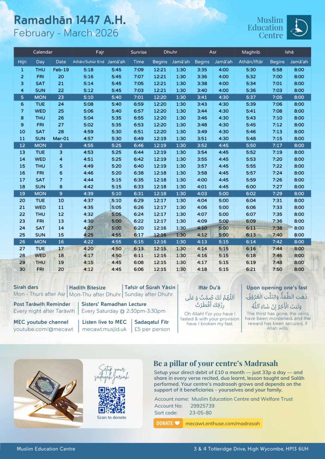 Get MEC salāh times on your phone and always stay up to date with the latest salāh times. You can also set reminders, notifications and add widgets to your home screen click here.